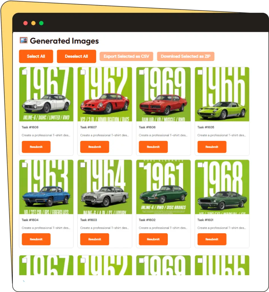 Once processing is complete, you can download all images at once as a ZIP file. You can also download a CSV file that includes the generated image URLs mapped back to your original data (SKUs/IDs).